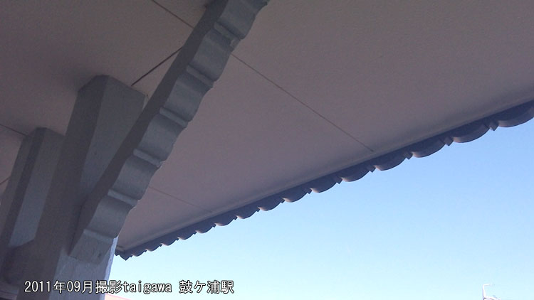 鼓ケ浦駅の出来た年代が今の時点でよくわかりませんが近代建築や洋風の建築によくみられるパージボードと呼ばれる、切り抜き板によく似た軒の飾りがあります。柱の周辺のデザインも何かこってますね。